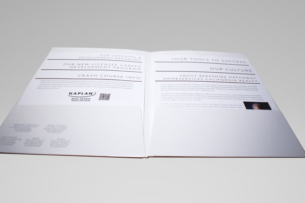 This packet is a recruitment piece, sent out to potential agents when they schedule their Real Estate Licensing Exam. They had been using the same packet for several years, and wanted to redesign it to be more modern and easy to read and process.
